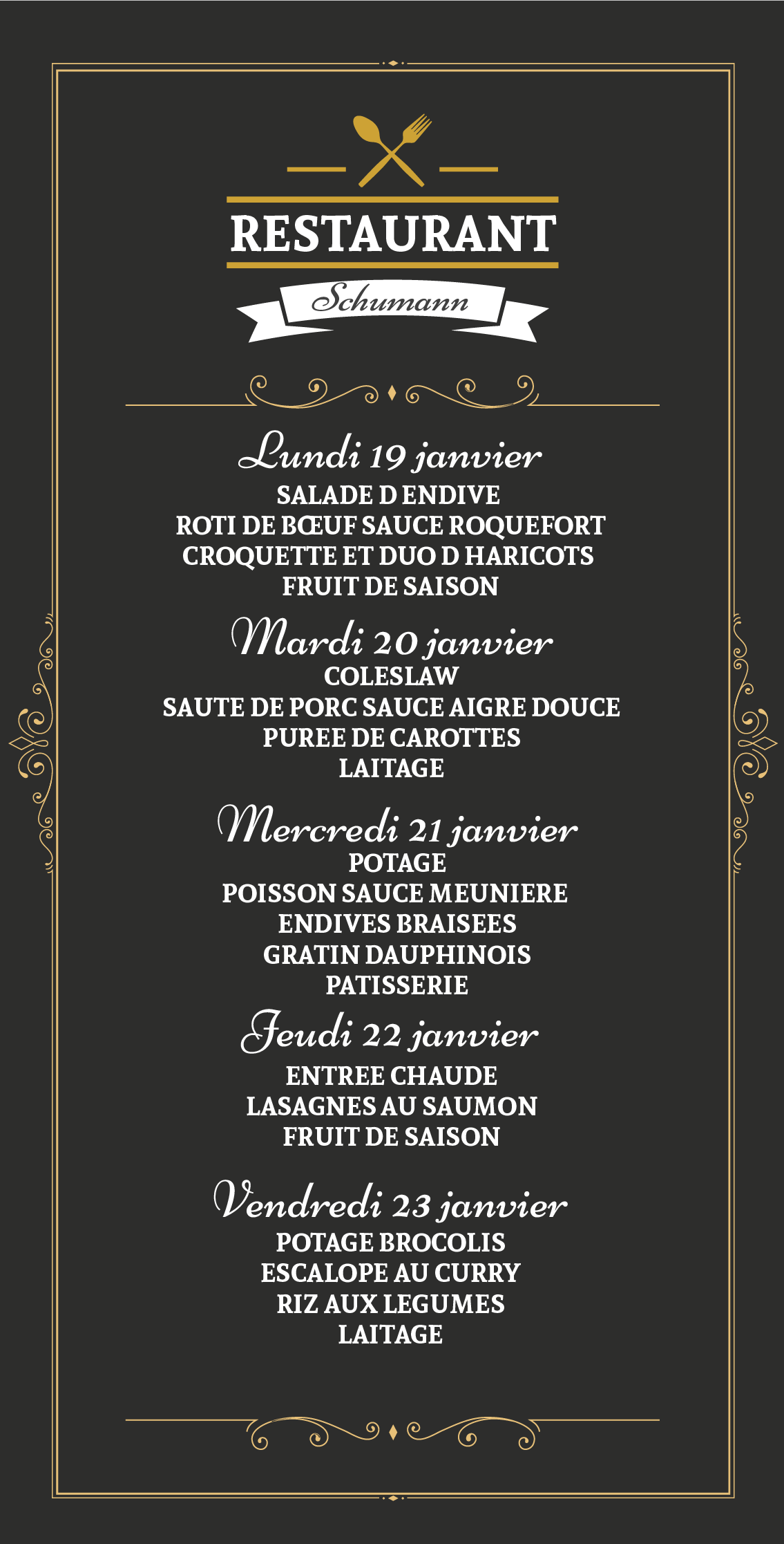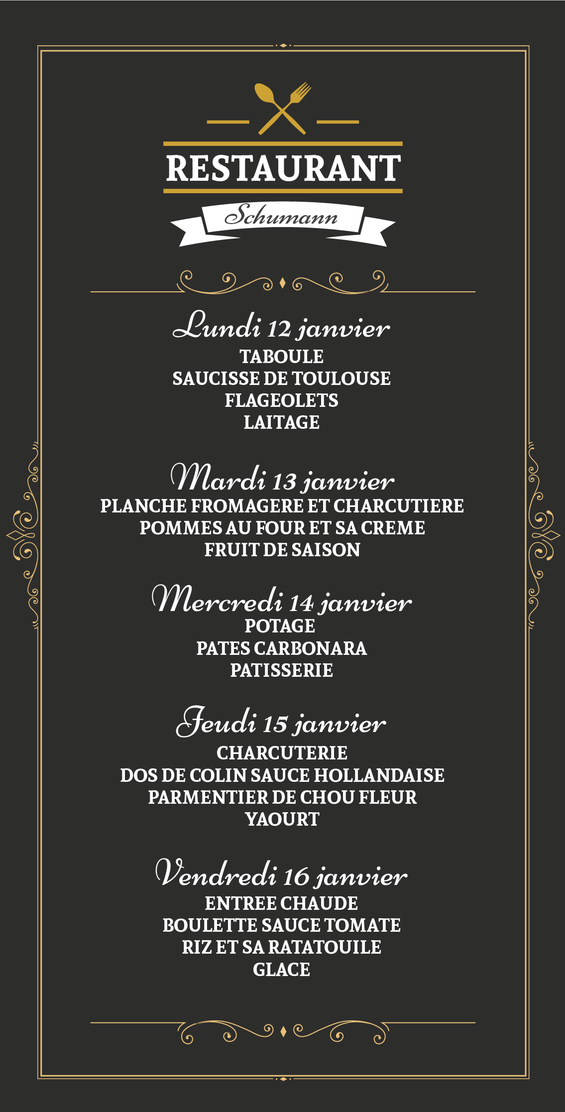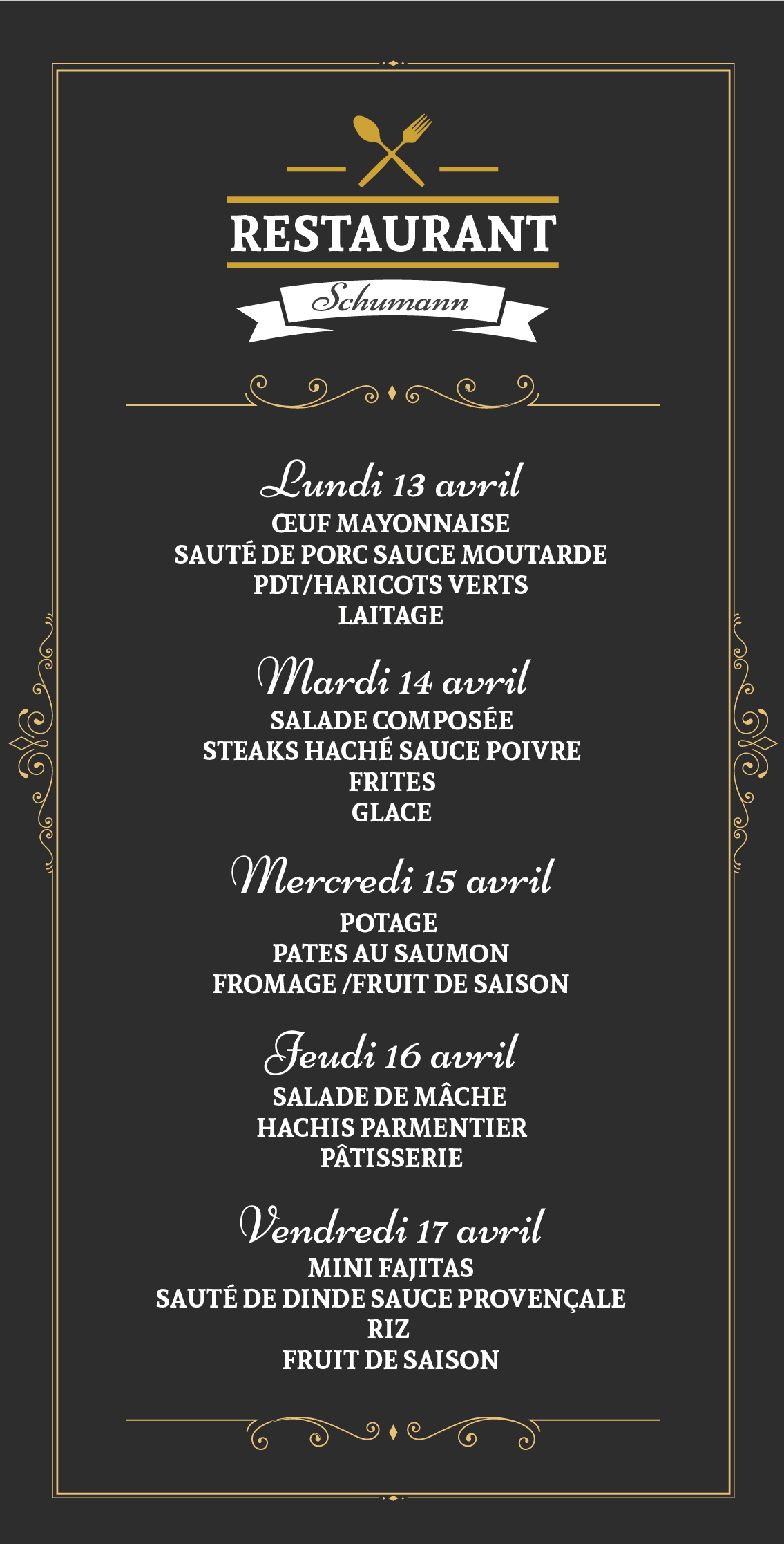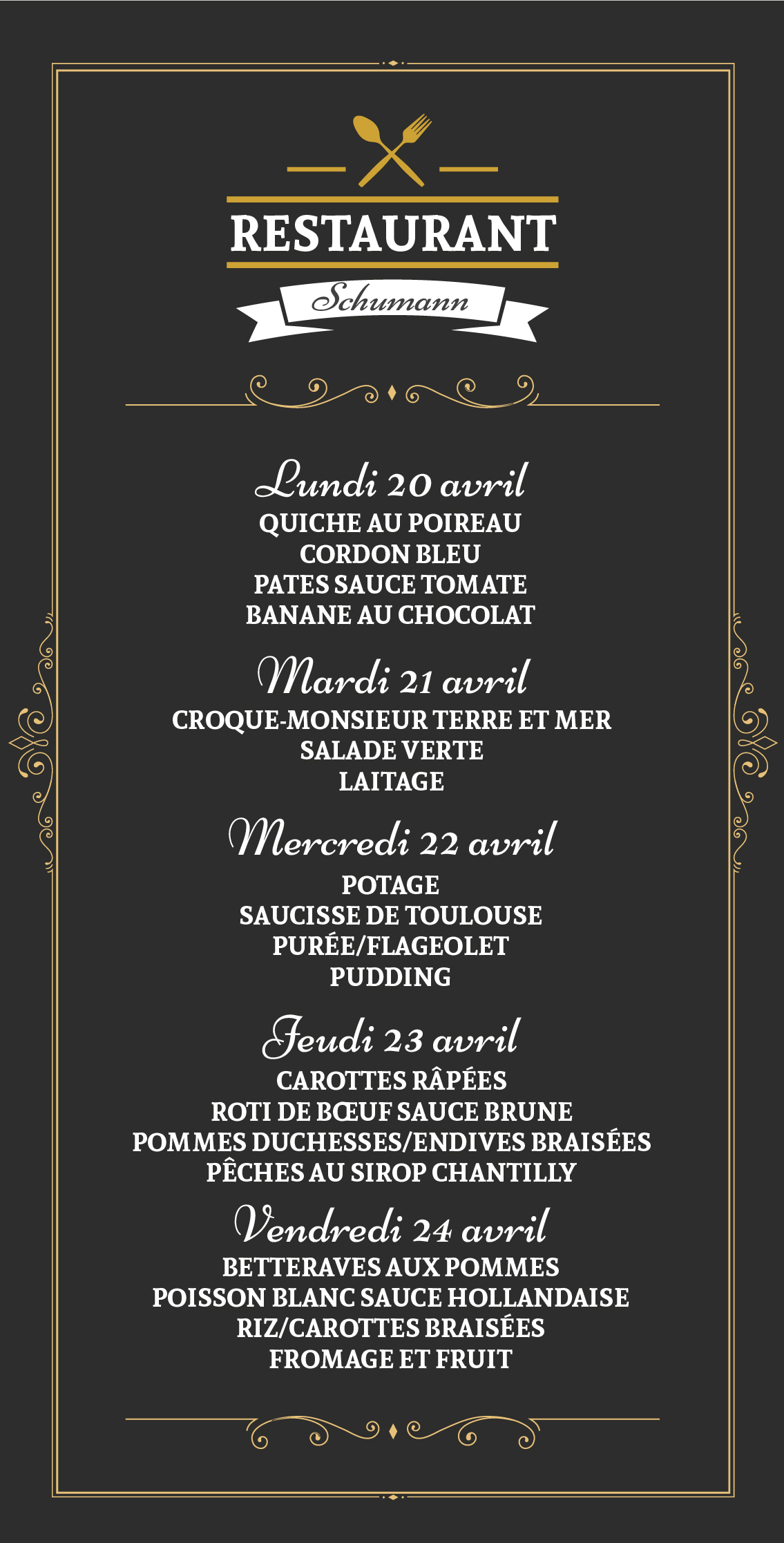 Réservations : la prise de réservations au restaurant Schumann se fait du lundi au jeudi 15 jours avant et pour les 15 jours suivants, par exemple les inscriptions prises le jeudi 19 octobre se font pour les repas des semaines du 30 octobre au 10 novembre.