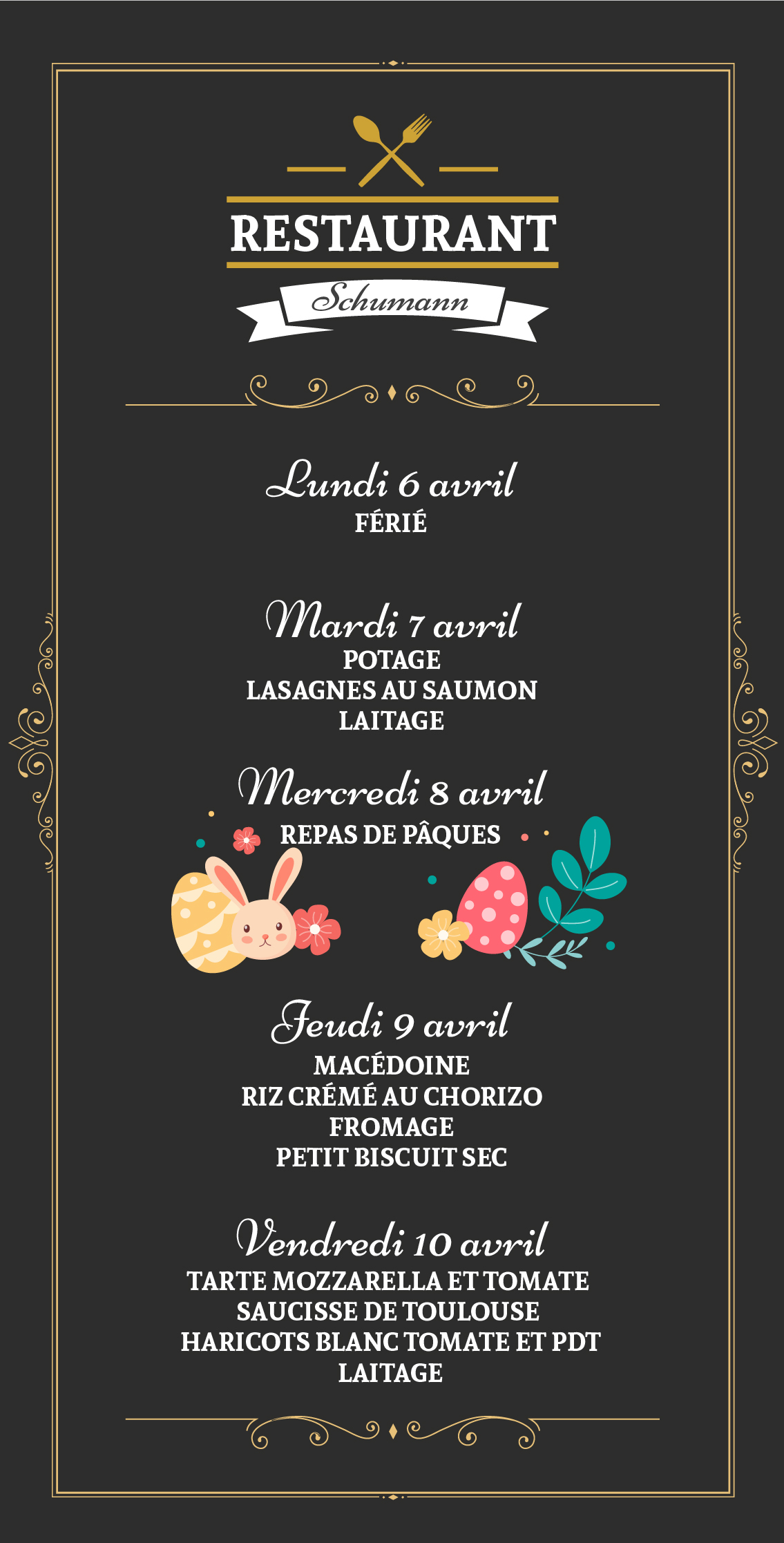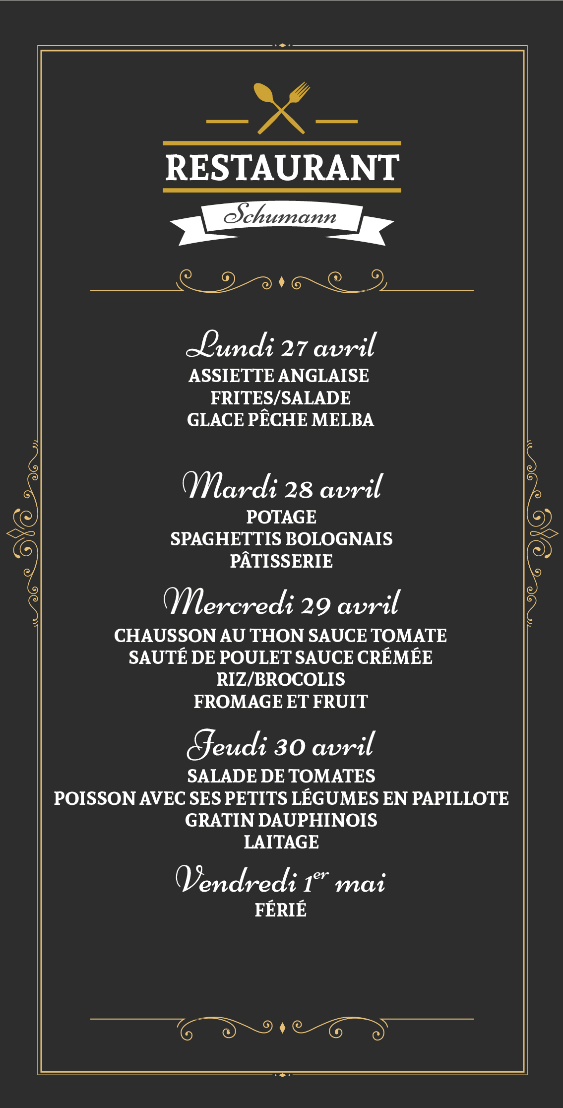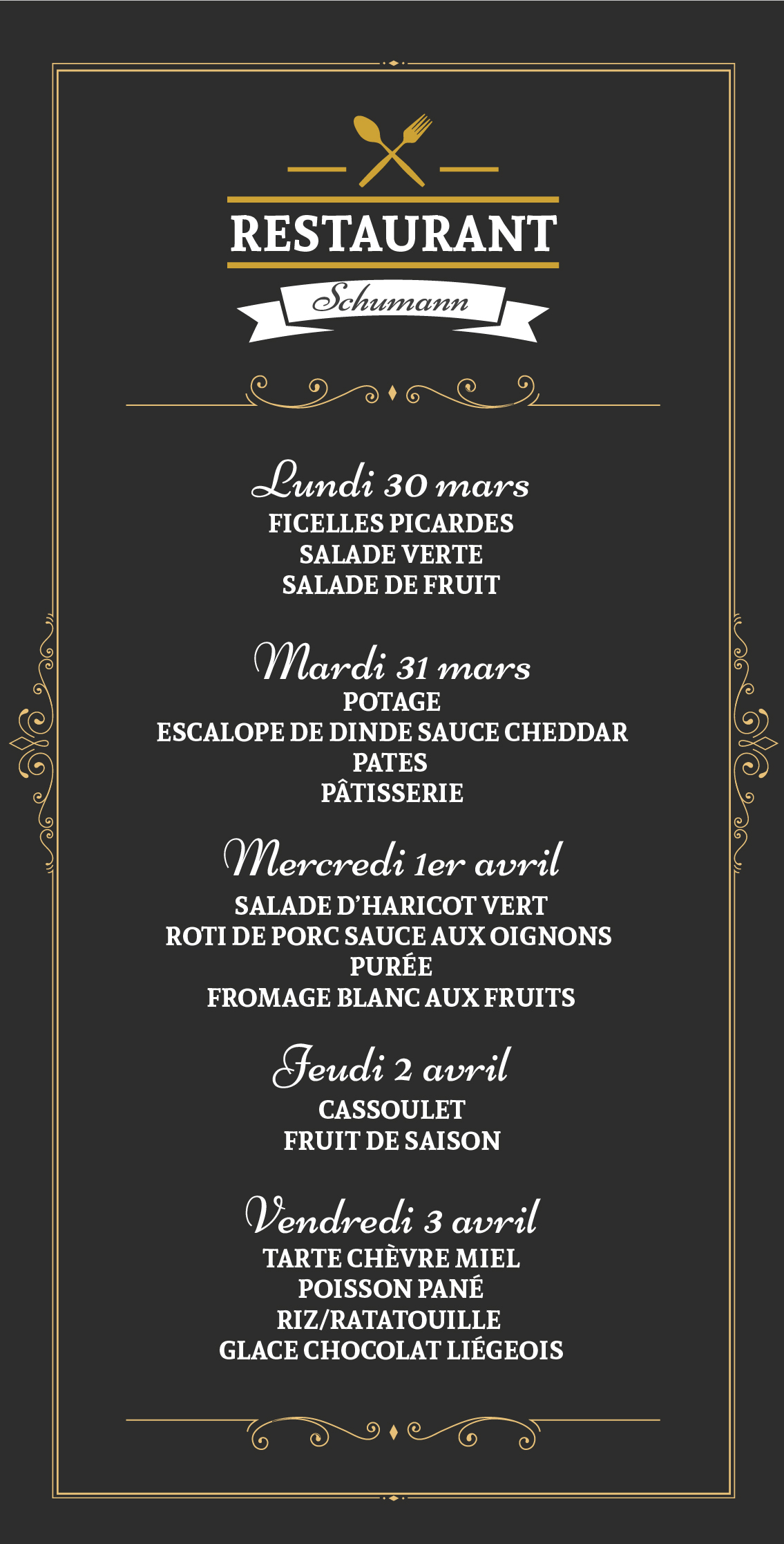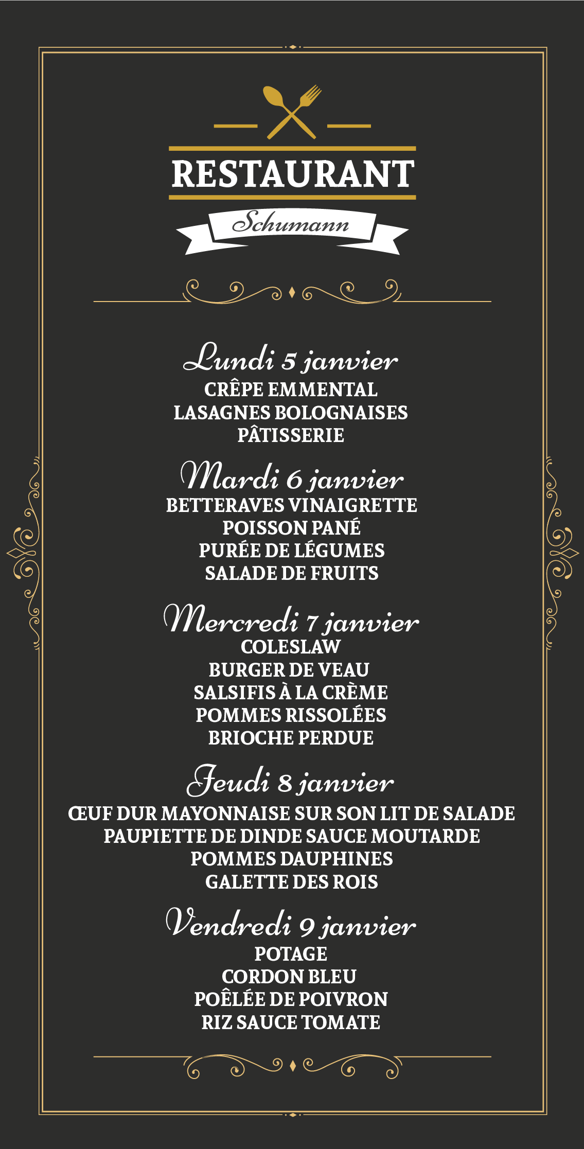 Réservations : la prise de réservations au restaurant Schumann se fait du lundi au jeudi 15 jours avant et pour les 15 jours suivants, par exemple les inscriptions prises le jeudi 19 octobre se font pour les repas des semaines du 30 octobre au 10 novembre.